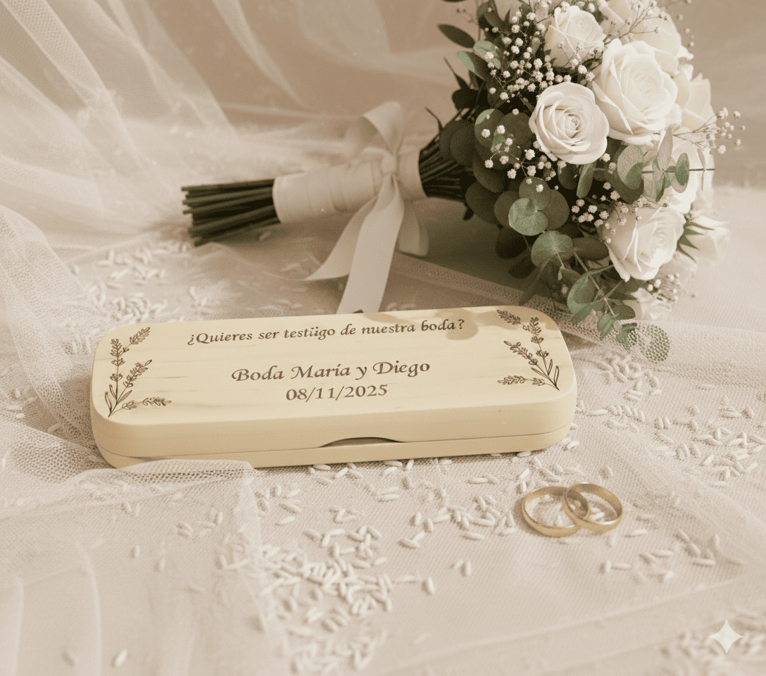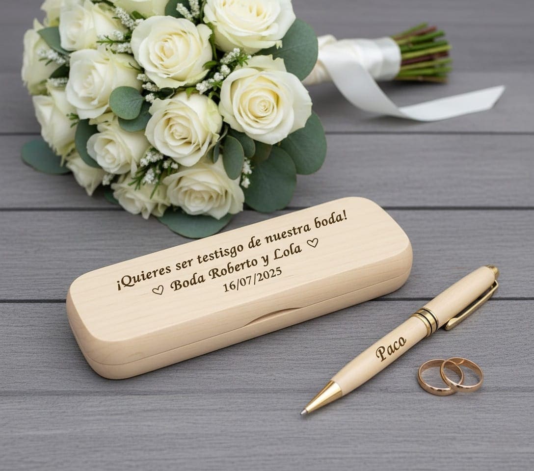 Y para que este gesto sea aún más personal y duradero, incluimos un elegante Bolígrafo, también grabado a láser con el nombre de vuestro futuro testigo. Un detalle práctico y sofisticado que podrán usar y atesorar para siempre.