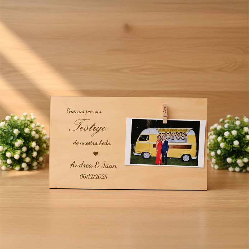 Placa de madera “Testigo de boda”, un detalle elegante y lleno de emoción para ese momento tan especial. Fabricada en madera de alta calidad, esta pieza combina sencillez y encanto natural, convirtiéndose en un recuerdo único del gran día.